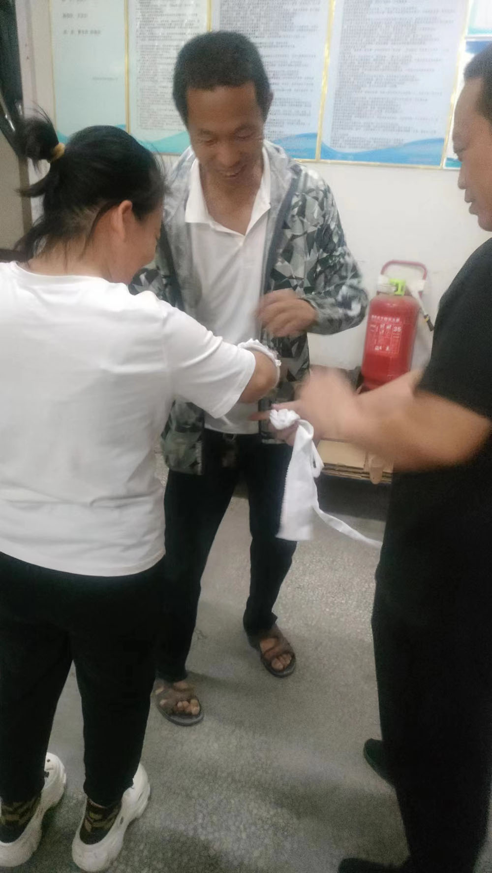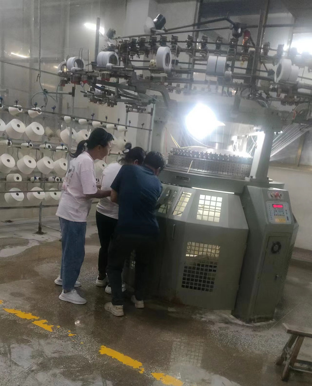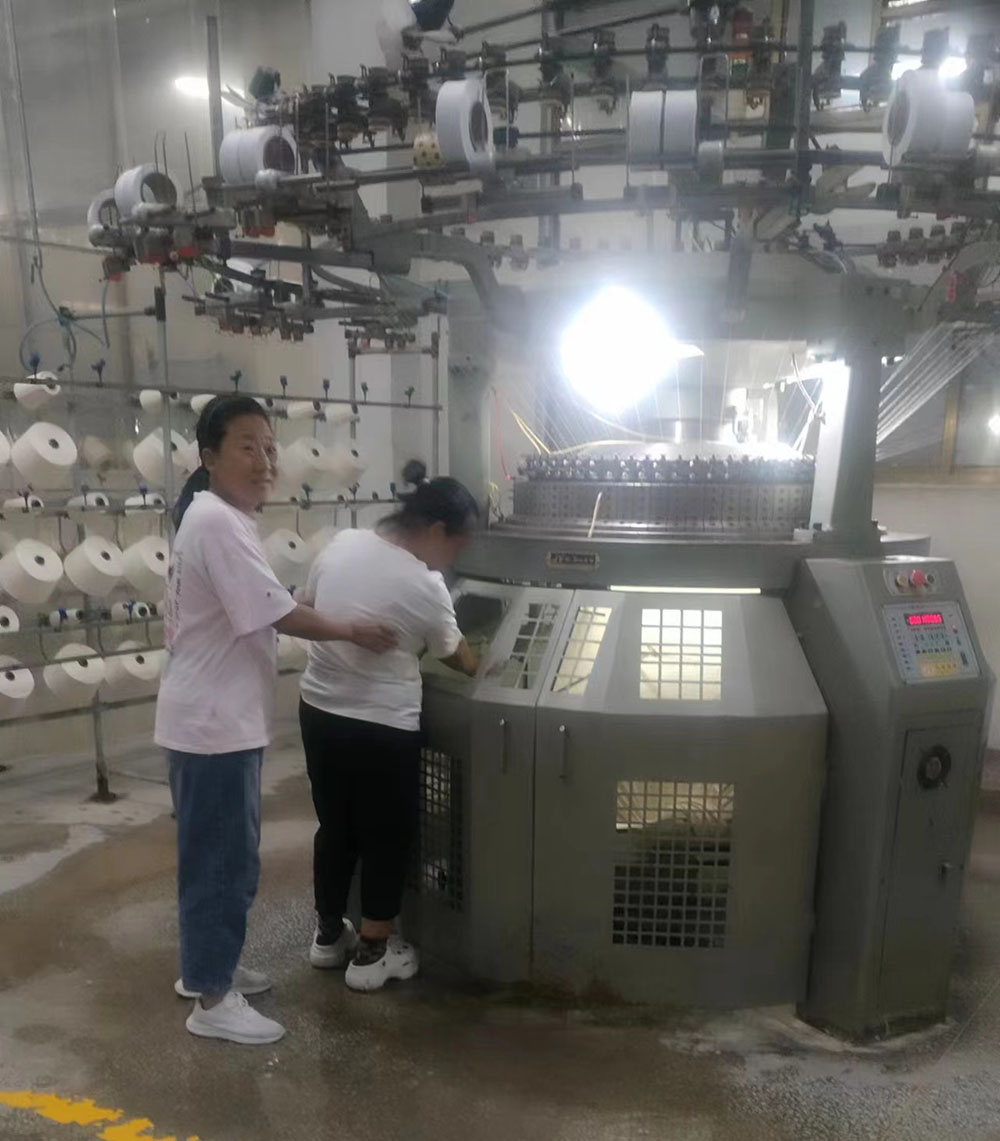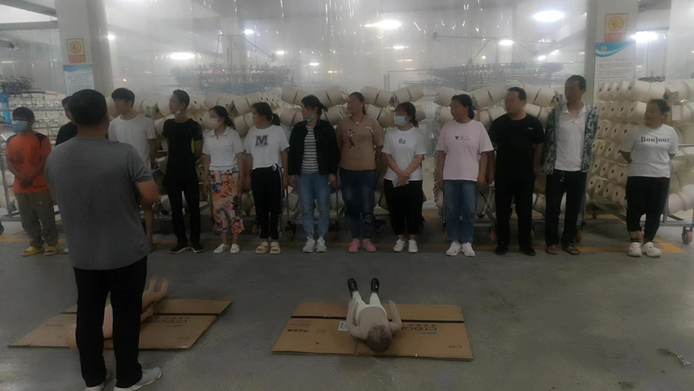 首先,模擬車間生產現(xiàn)場出現(xiàn)機械傷害事故,有員工被卷入大圓機中受傷,馬上啟動應急預案。各應急小組緊張地投入到應急救援工作之中,搶救傷員、救護包扎、緊急聯(lián)絡,各項工作有序展開。救援小組立即關停機器,將受傷員工從機器中搶救出來。救護小組給傷員檢查傷情,包扎止血。聯(lián)絡小組打120請求派救護車緊急救護,受傷員工得到了及時救治。