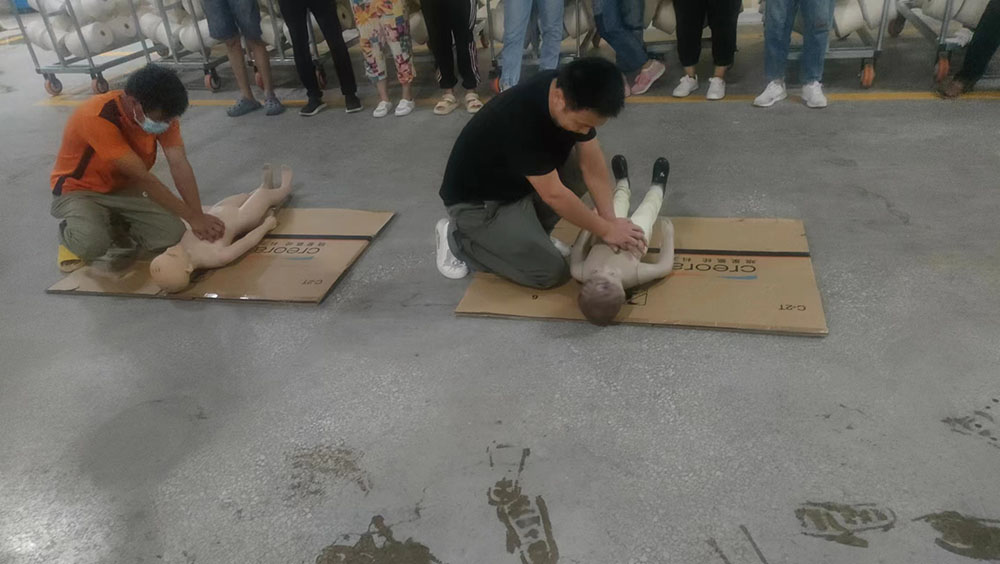 隨后,公司組織員工進行了休克、昏迷緊急救護演練,呼吸心跳驟停緊急救護演練,所有員工參加了心肺復蘇操作訓練。